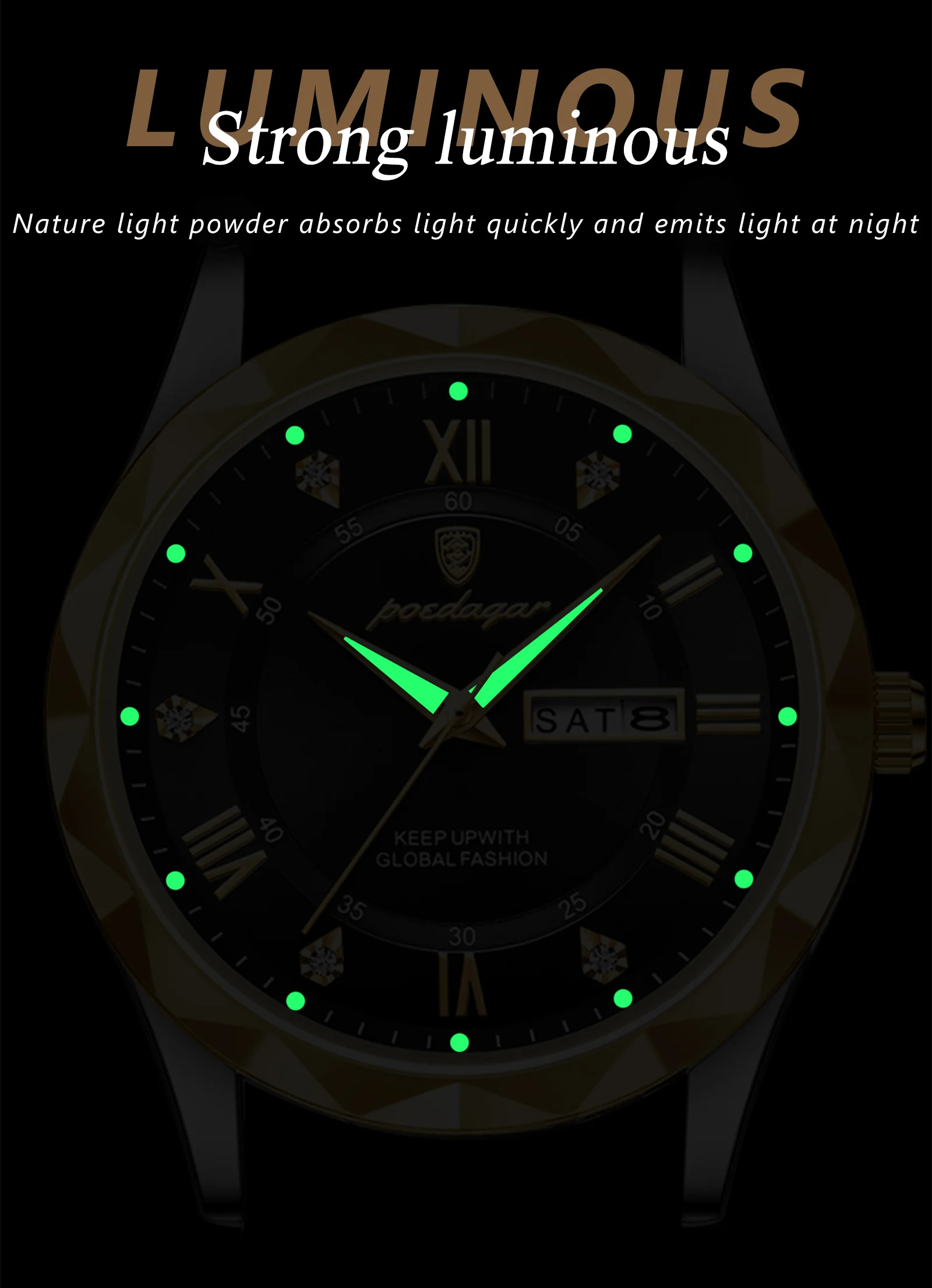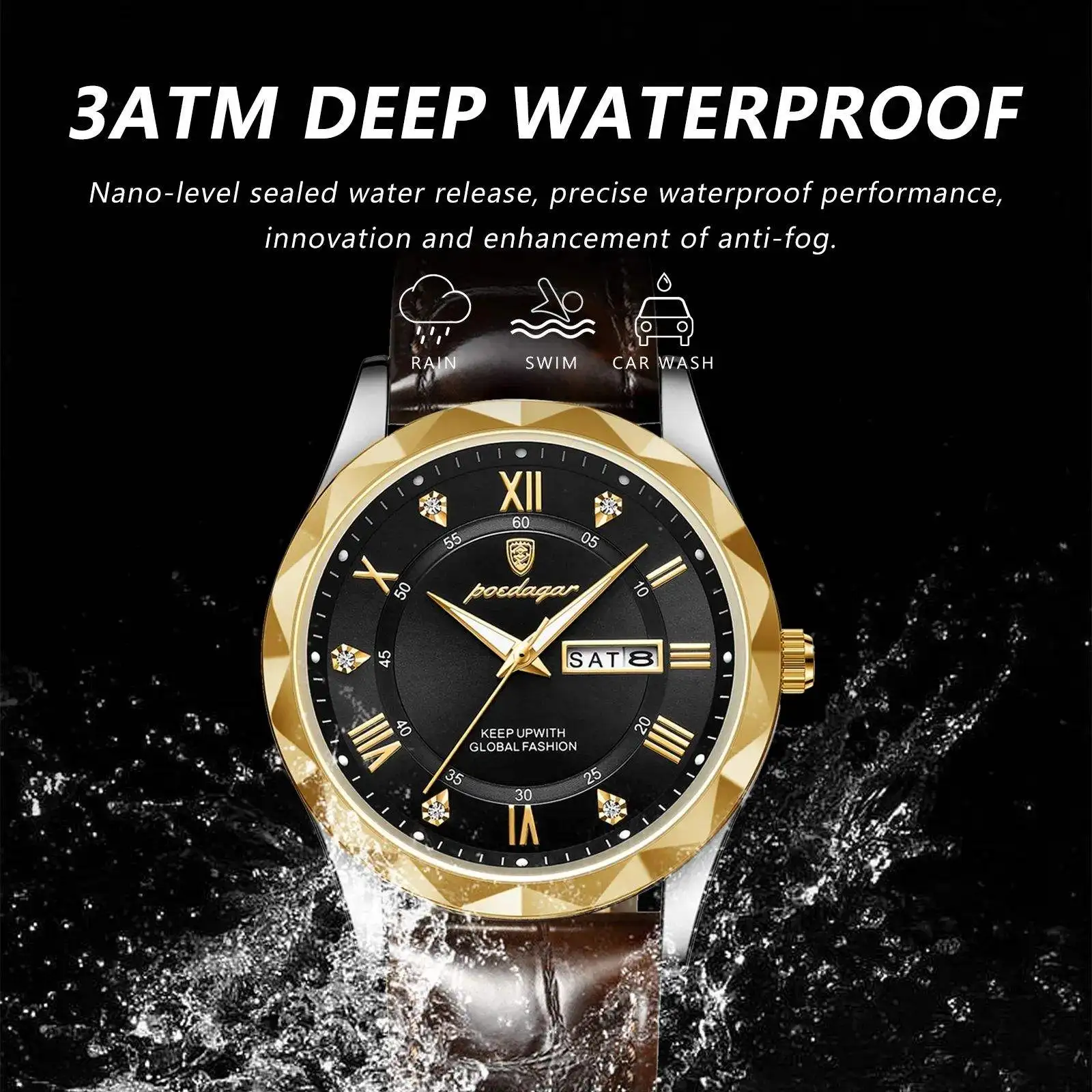 Men's Watch — Water-Resistant, Luminous, Date and Day Display, Quartz Movement, Genuine Leather Strap