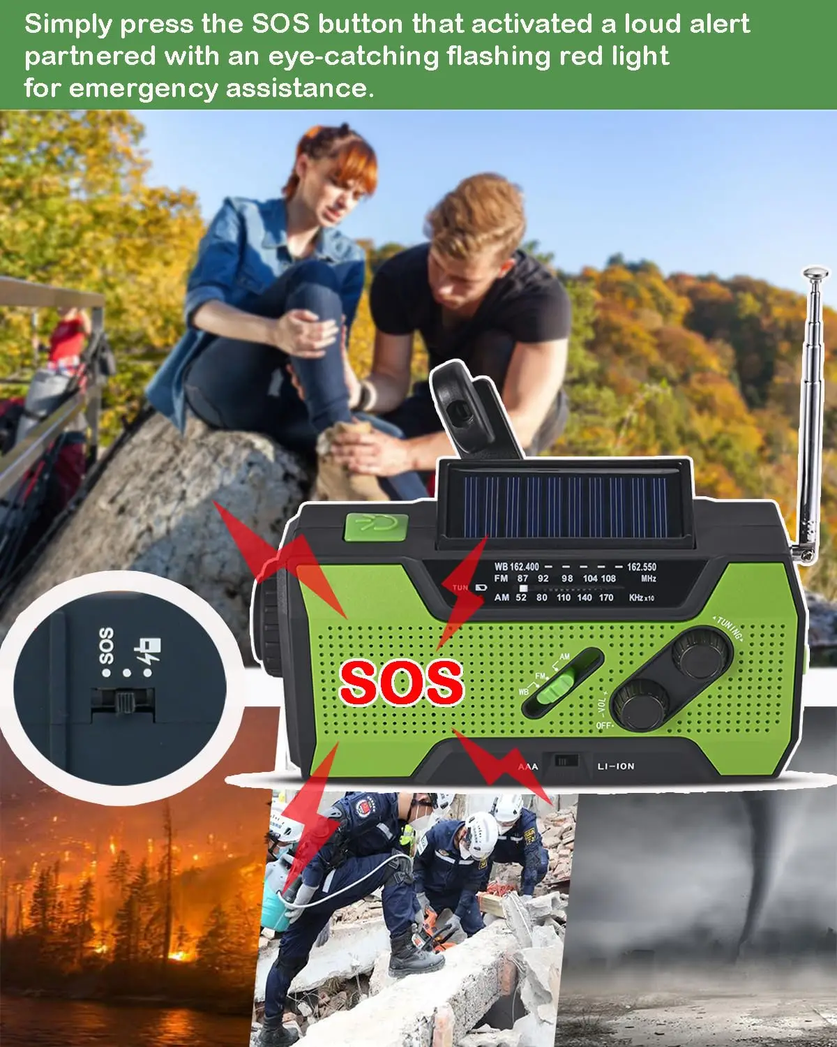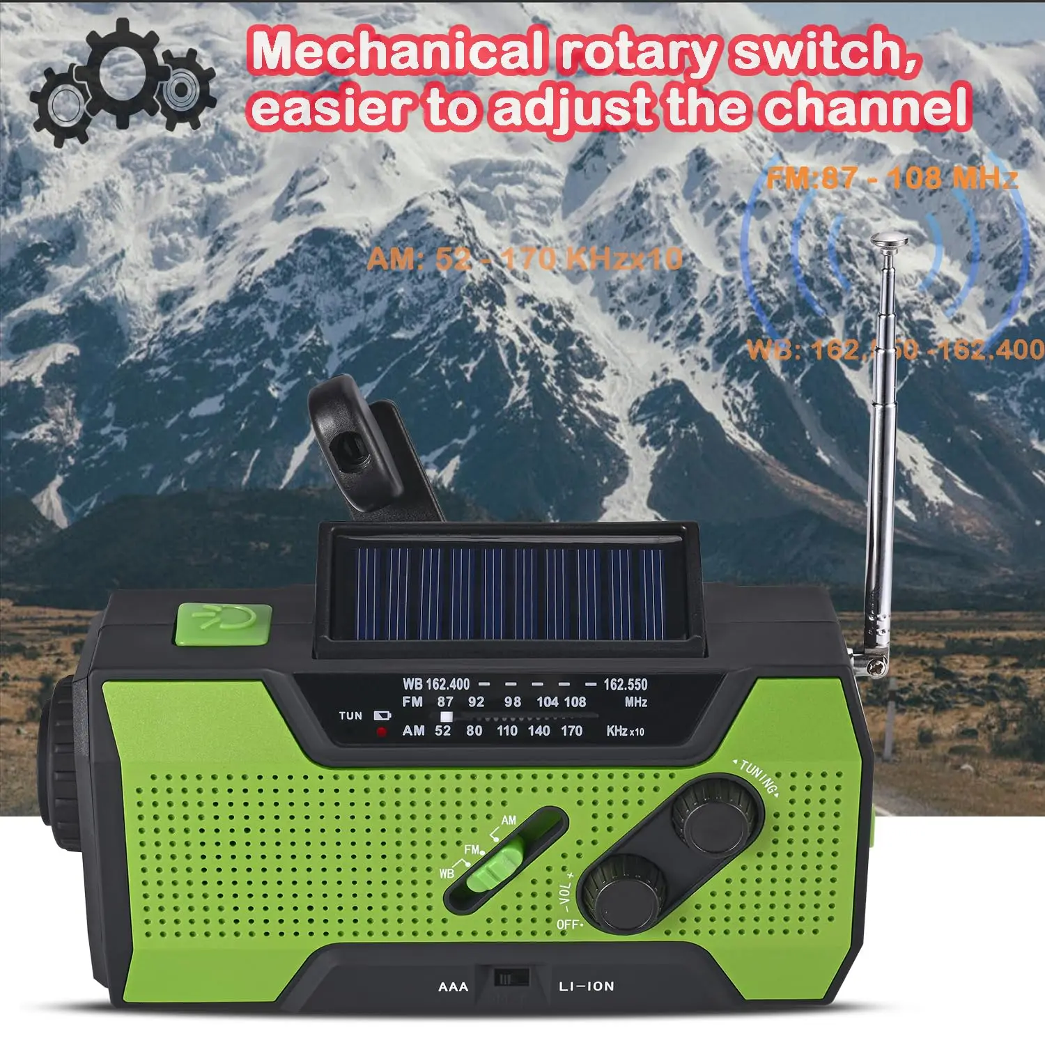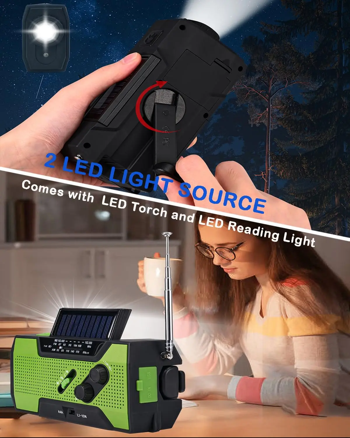 2. [3 POWER SOURCES POWER WHEN YOU NEED IT] Use the emergency weather radio's 3 power sources when you need a boost of power or need to recharge the radio. The radio's crank lever and solar panel are both capable of regenerating enough power to keep the radio,lights, and SOS alarm ready to go when you need it most. AAA Batteries ensure you have power when not able to regenerate power.
