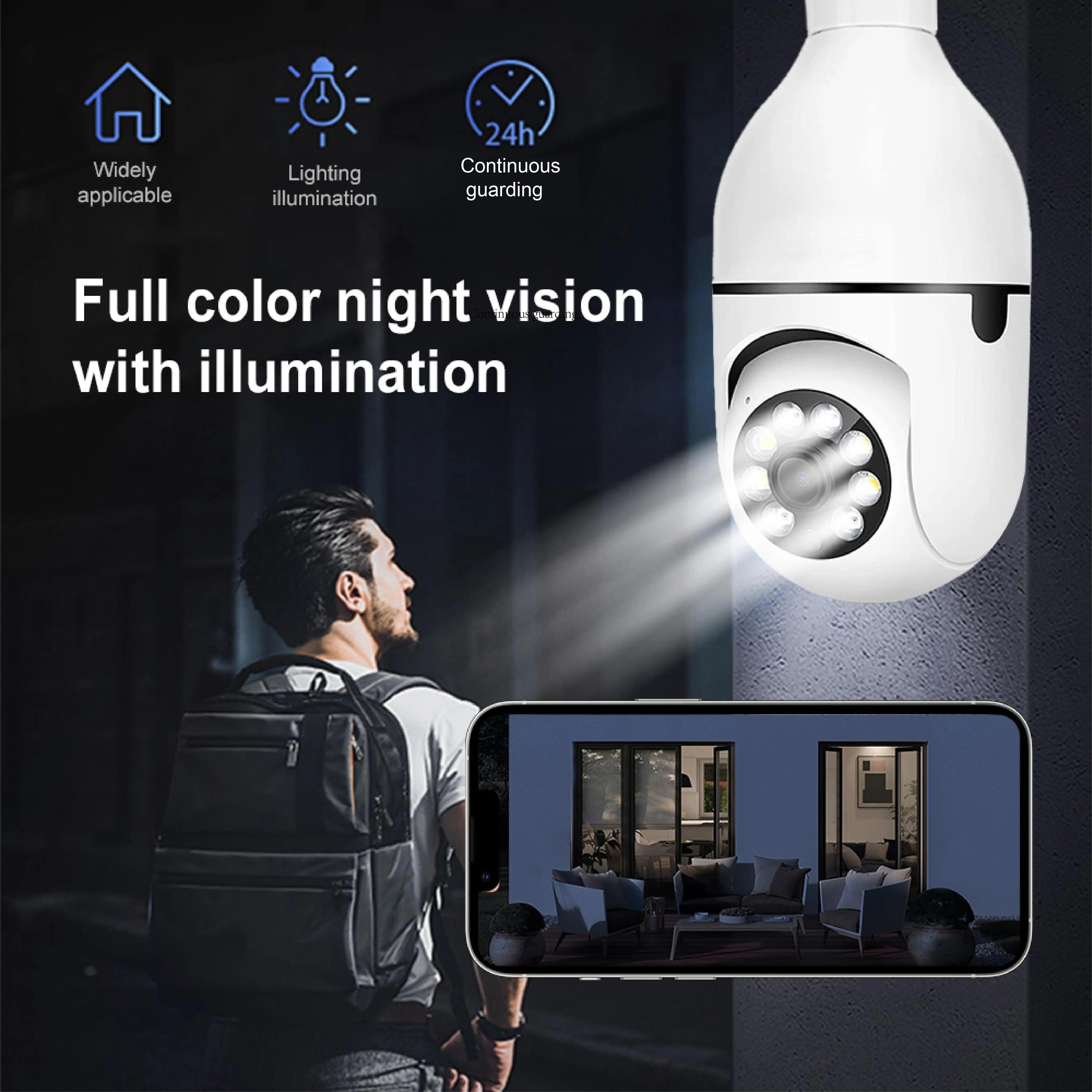 Ultra-low price outdoor two-way wireless light bulb camera with motion detection and 360-degree panoramic WiFi connectivity.